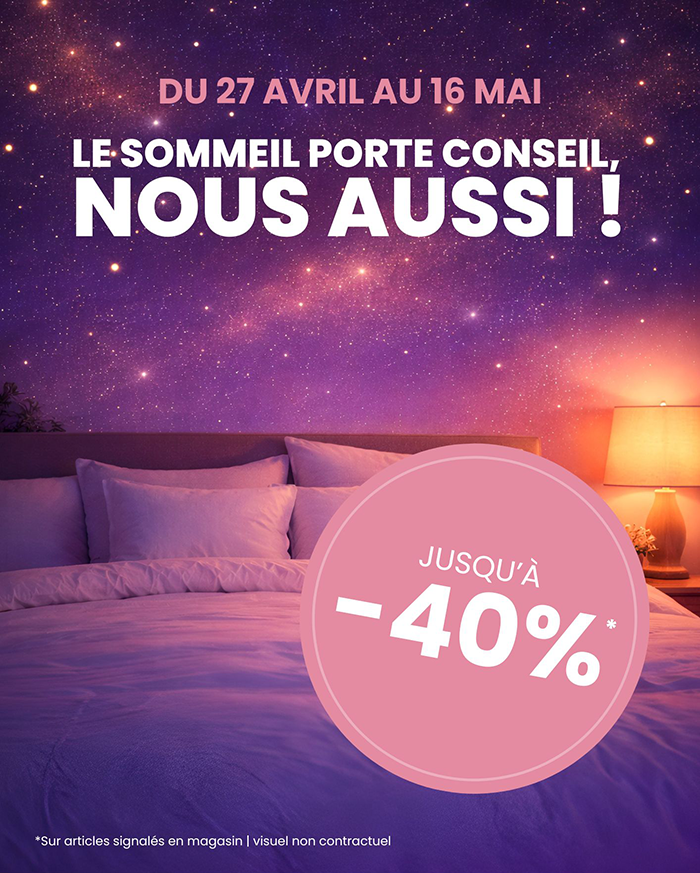 Profitez de la promo LA NUIT PORTE CONSEIL dans vos magasins Nuits de Rêve de TRIGNAC, SAINT-HERBLAIN et SARAN du 27 avril au 16 mai